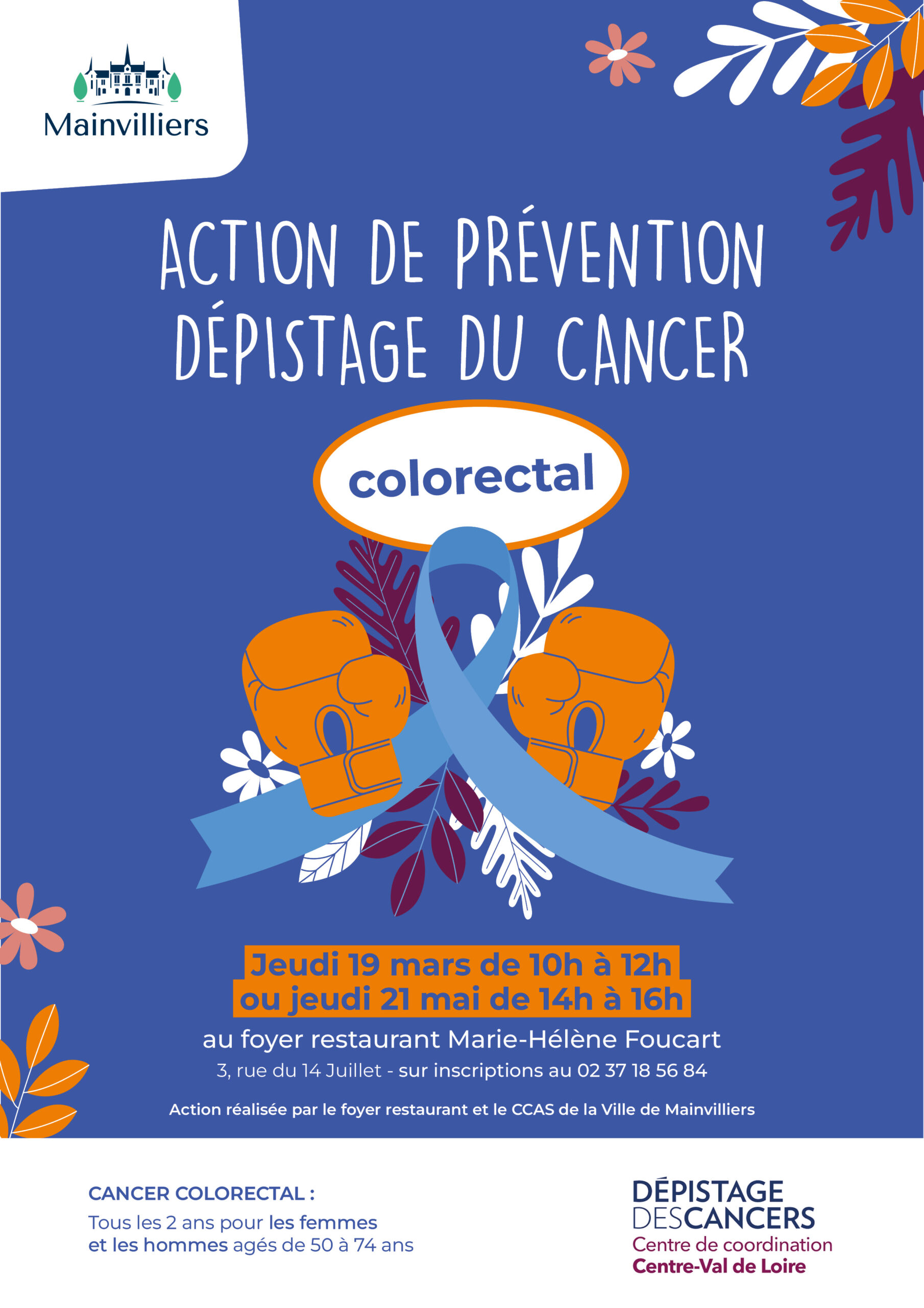 Des actions de dépistages du cancer colorectal sont organisés le jeudi 19 mars 2026 de 10h à 12h ou le jeudi 21 mai 2026 de 14h à 16h au foyer restaurant Marie-Hélène Foucart.