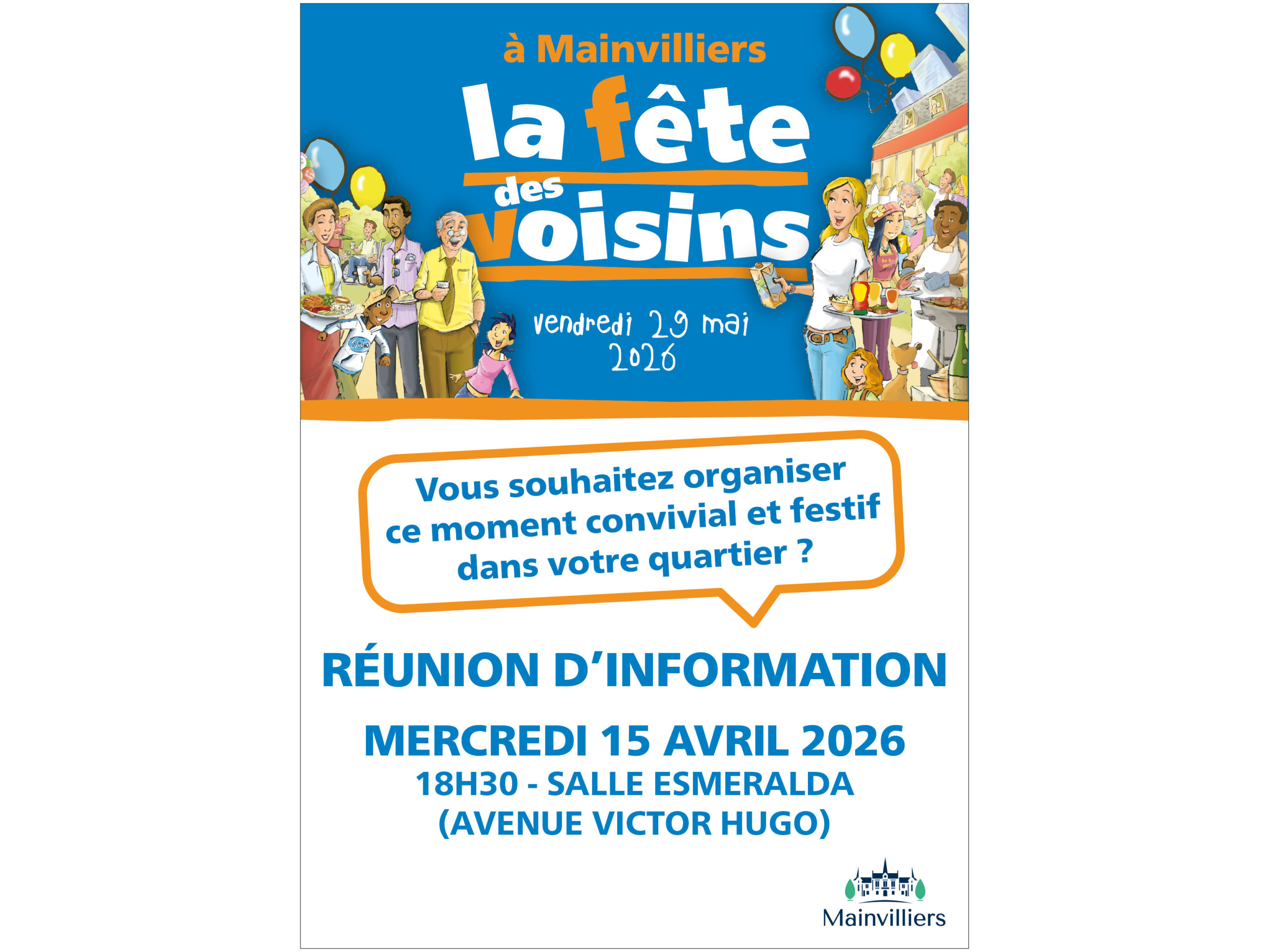 C’est le retour de l’événement annuel de la Fête des voisins vendredi 29 mai 2026. Si vous souhaitez organiser ce moment convivial et festif dans votre quartier, rejoignez-nous mercredi 15 avril 2026 à 18h30, à la salle Esmeralda (avenue Victor Hugo), pour une réunion d’information ouverte à tous les habitants.