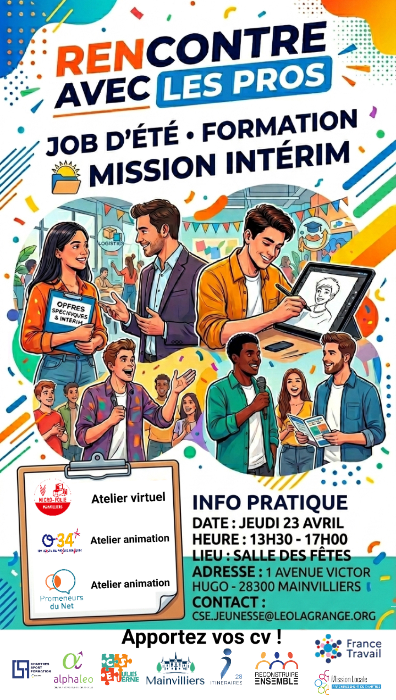Le centre socio-éducatif Jules Verne organise un job dating le jeudi 23 avril 2026 de 13h30 à 17h à la salle des fêtes de Mainvilliers :
